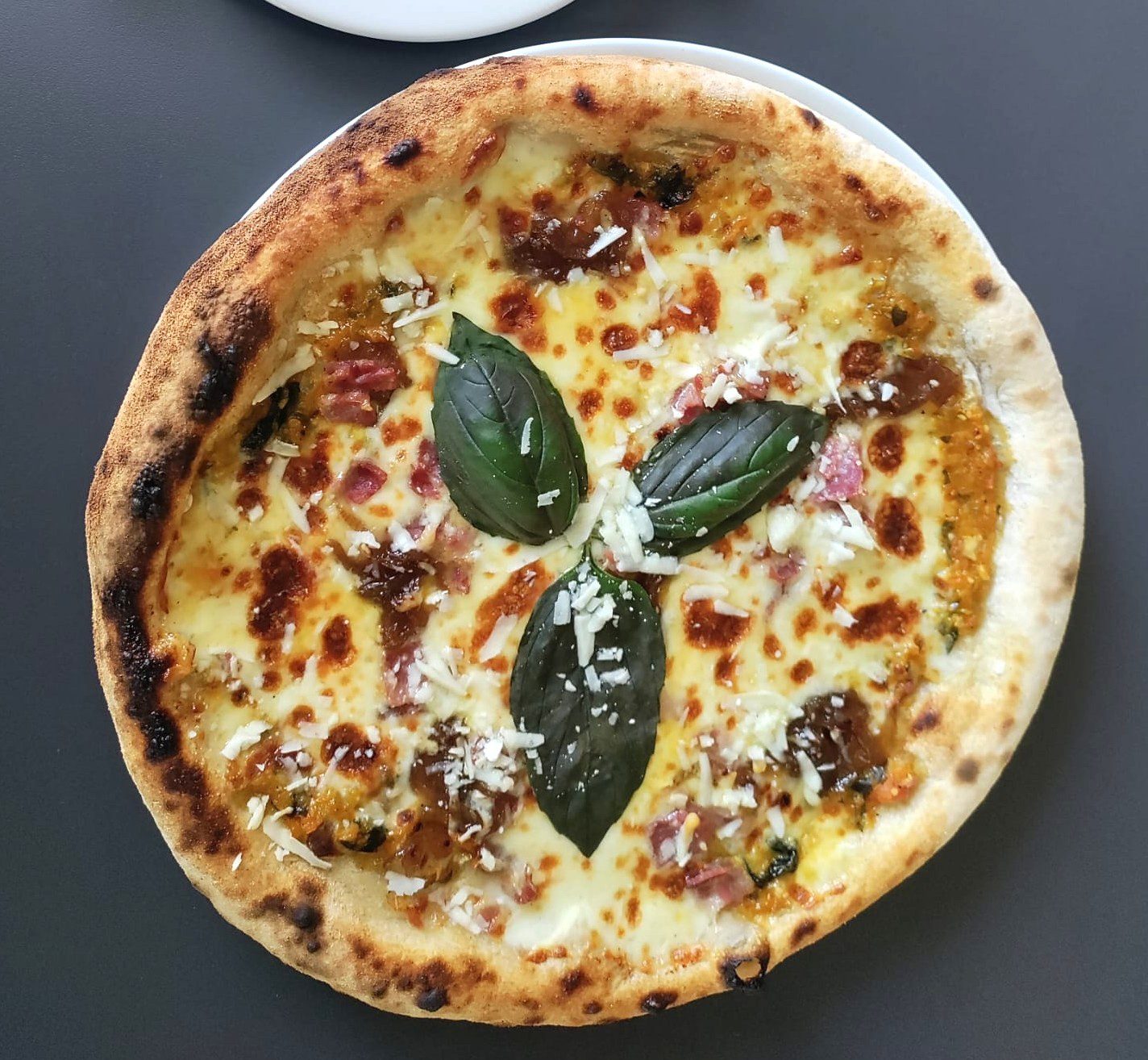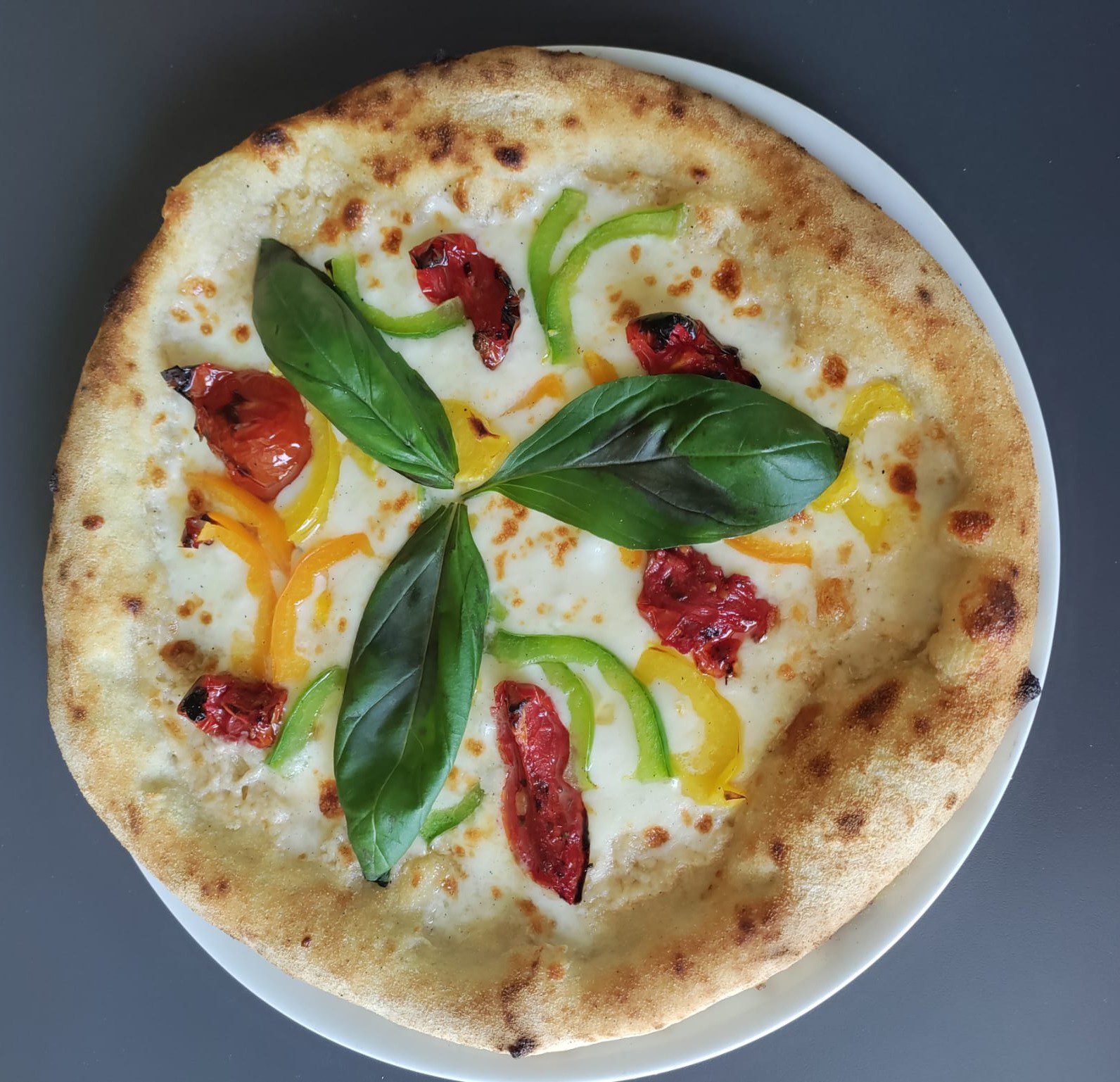 Mozzarella Fior di Latte, cream of cacio and pepe, sun-dried cherry tomatoes, guanciale, mixed coloured peppers, basil