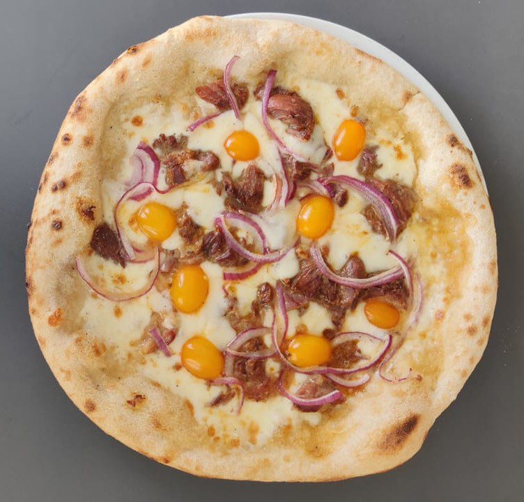 Tomato sauce, mozzarella Fior di Latte, mushrooms, egg, ham, bacon, Maltese sausages, onions
