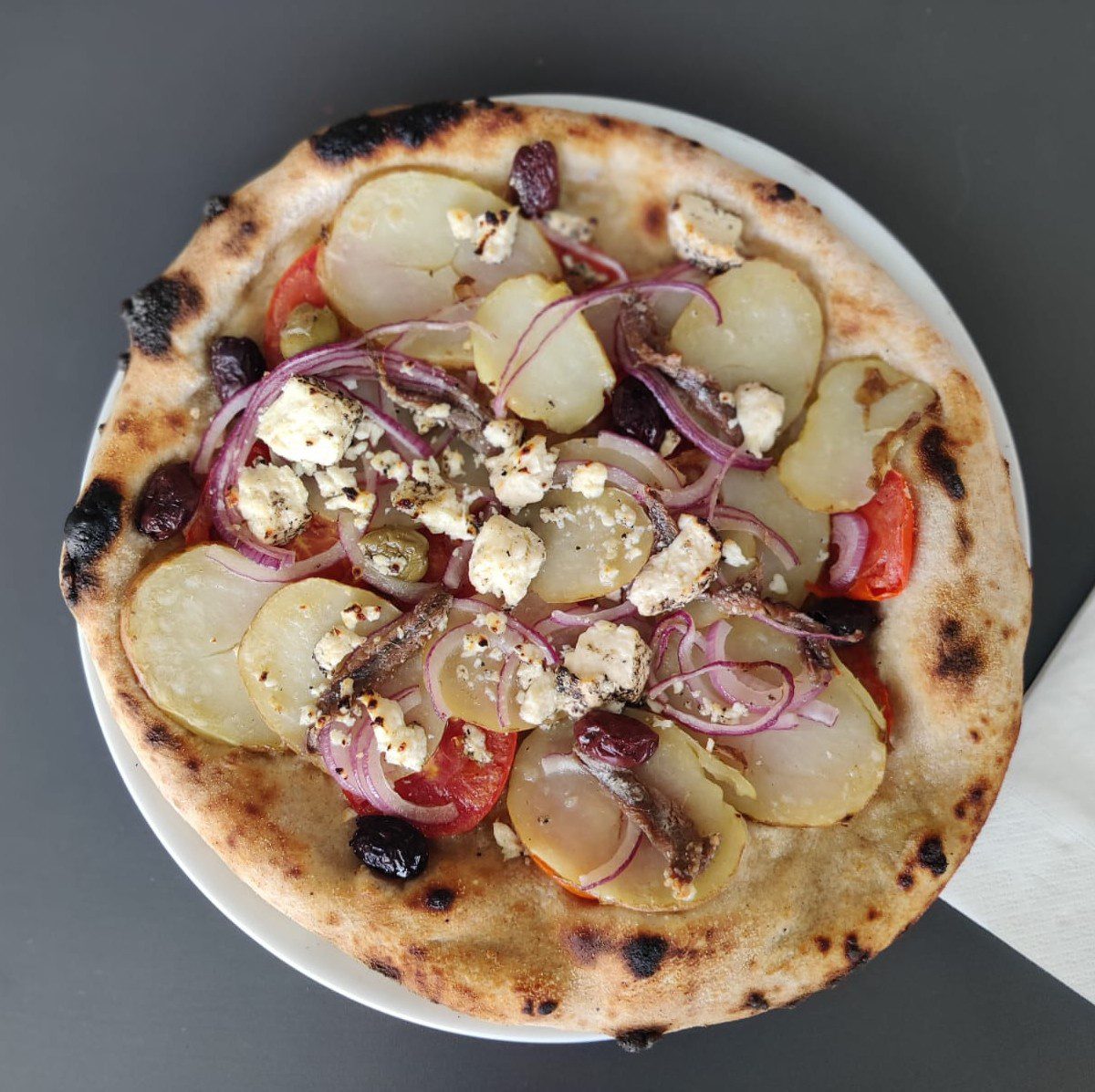 Fresh local tomatoes, sliced potatoes, anchovy fillets, fresh onions, black olives, dried Maltese gbejna, basil oil