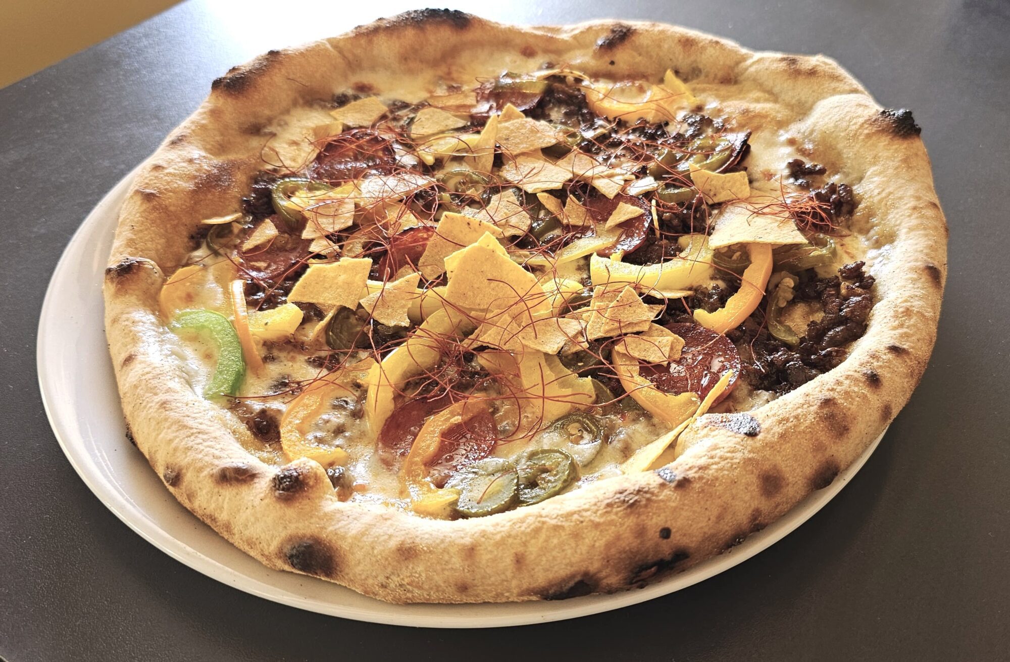 Mozzarella Fior di Latte, spicy minced meat, mixed coloured peppers, sweet chilli, pepperoni, jalapenos, crushed tortilla, chilli fibres